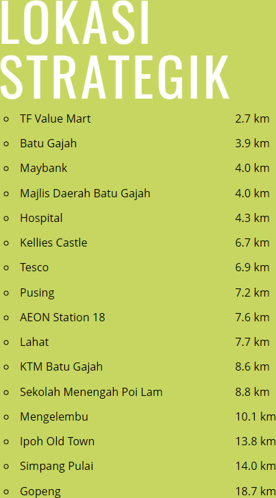 No Lesen Pemaju : 14432-4/03-2020/0307(L) (Tempoh Sah: 28/03/2018 hingga 27/03/2020) • No Permit Iklan :14432-4/03-2020/0307(P) (Tempoh Sah: 28/03/2018 hingga 27/03/2020) • Bebanan Tanah : CIMB ( Cawangan Greentown) • Pajakan Tanah : 99 Tahun ( Tempoh Tamat: 23hb Julai 2114 ) • No.Kelulusan Pelan Bangunan : MDGK.F3/26/242/2016 (9) • Tarikh kelulusan : 18hb Januari 2017 • Pihak Berkuasa : Majlis Daerah Batu Gajah • Tarikh Dijangka Siap : Sept 2019 • Sekatan- Sekatan Penting : Tanah ini hanya boleh dipindahmilik atau dipajak dengan kebenaran bertulis oleh pihak Berkuasa Negeri sekatan ini dikecualikan kepada kaum bumiputera bagi pindahmilik kedua dan seterusnya. • Jenis C_22’ x 70’ (89 unit) : Fasa 4 – 26 unit – Min RM 290,000.00 Maks RM 413,375.00 Fasa 5 – 24 unit – Min RM 290,000.00 Maks RM 403,700.00 Fasa 6 – 21 unit – Min RM 290,000.00 Maks RM 388,220.00 Fasa 7 – 18 unit – Min RM 290,000.00 Maks RM 411,440.00 • 5% diskaun untuk Lot Bumiputera • Jenis D_22’ x 80’ (50 unit) : Fasa 1 – 20 unit – Min RM 320,000.00 Maks RM 555,515.00 Fasa 2 – 18 unit – Min RM 320,000.00 Maks RM 524,015.00 Fasa 3 – 12 unit – Min RM 320,000.00 Maks RM 468,320.00