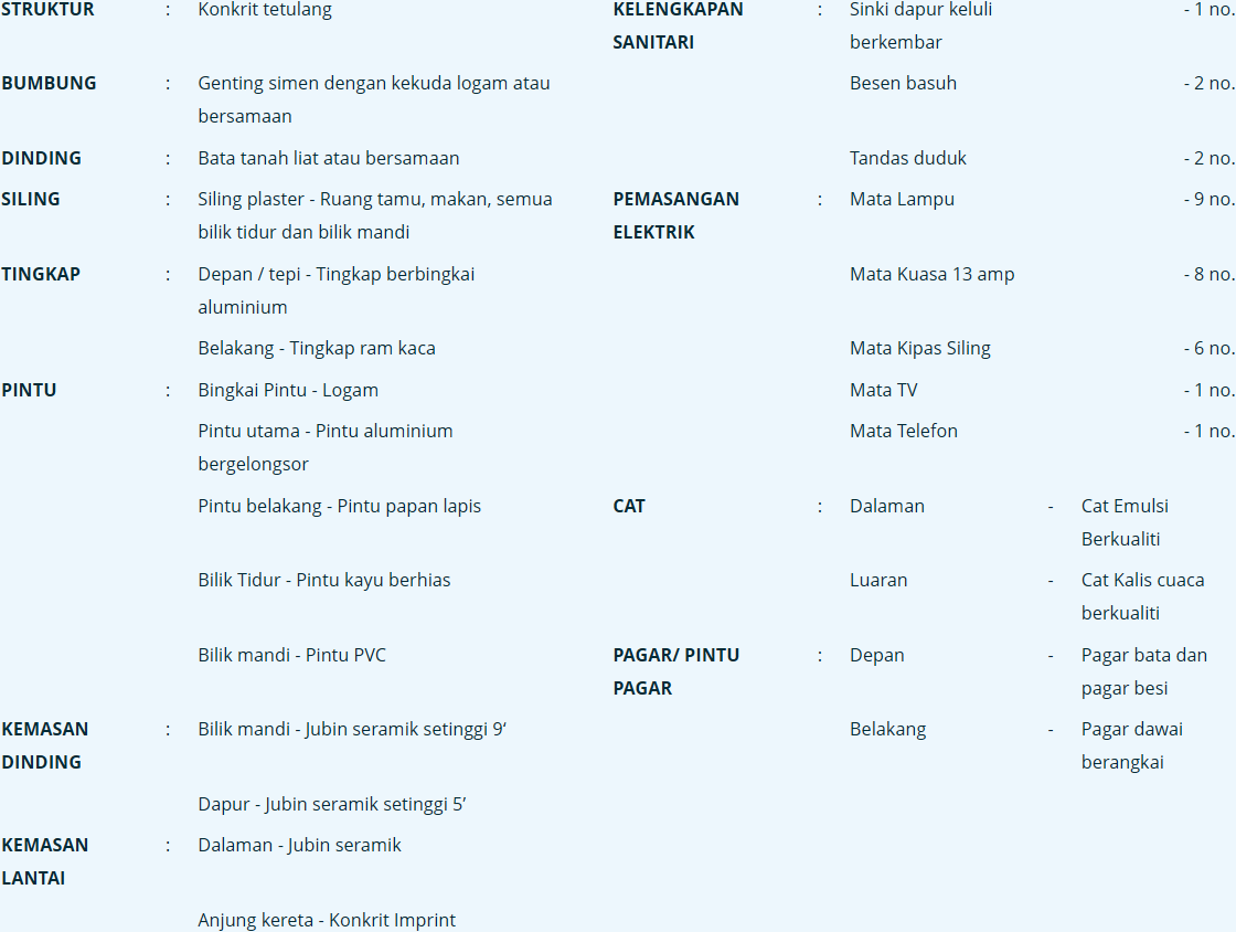 No Lesen Pemaju: 14432-2/12-2018/01021(L) (Tempoh Sah: 30/12/2016 hingga 29/12/2018 ) No Permit Iklan: 14432-2/12-2018/01021(P) (Tempoh Sah: 30/12/2016 hingga 29/12/2018) Bebanan Tanah : Malayan Banking Berhad Harga : Rumah Banglo Satu Tingkat • (Fasa 2_2 UNIT) Min :RM 588,000.00 (Lot Tengah) Maks:RM 592,900.00 (Lot Tepi) Tarikh dijangka siap : Dis 2019 • (Fasa3_2 UNIT) Min RM 642,985.00 (Lot Tengah) Maks RM 736,750.00 (Lot Tepi) Tarikh dijangka siap : Dis 2020 • (Fasa 4_2 UNIT) Min RM 588,000.00 (Lot Tengah) Maks RM 647,500.00 (Lot Tepi) Tarikh dijangka siap : Dis 2020 • (Fasa 5_2 UNIT) Min RM 588,000.00 (Lot Tengah) Maks RM 588,000.00 (Lot Tepi) Tarikh dijangka siap : Dis 2020 • (Fasa 6_2 UNIT) Min RM 588,000.00 (Lot Tengah) Maks RM 588,000.00 (Lot Tepi) Tarikh dijangka siap : Dis 2020 5% diskaun untuk lot Bumiputera kuota Pajakan Tanah: 99 Tahun (Tempoh sah 14-07-2103) No. Kelulusan Pelan: MDBG.F3/8/69/2016(15) Pihak berkuasa: Majlis Daerah Batu Gajah Sekatan -sekatan Kepentingan: Tiada